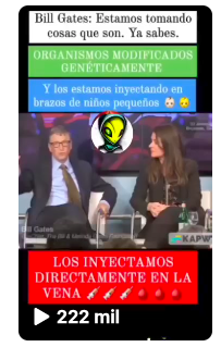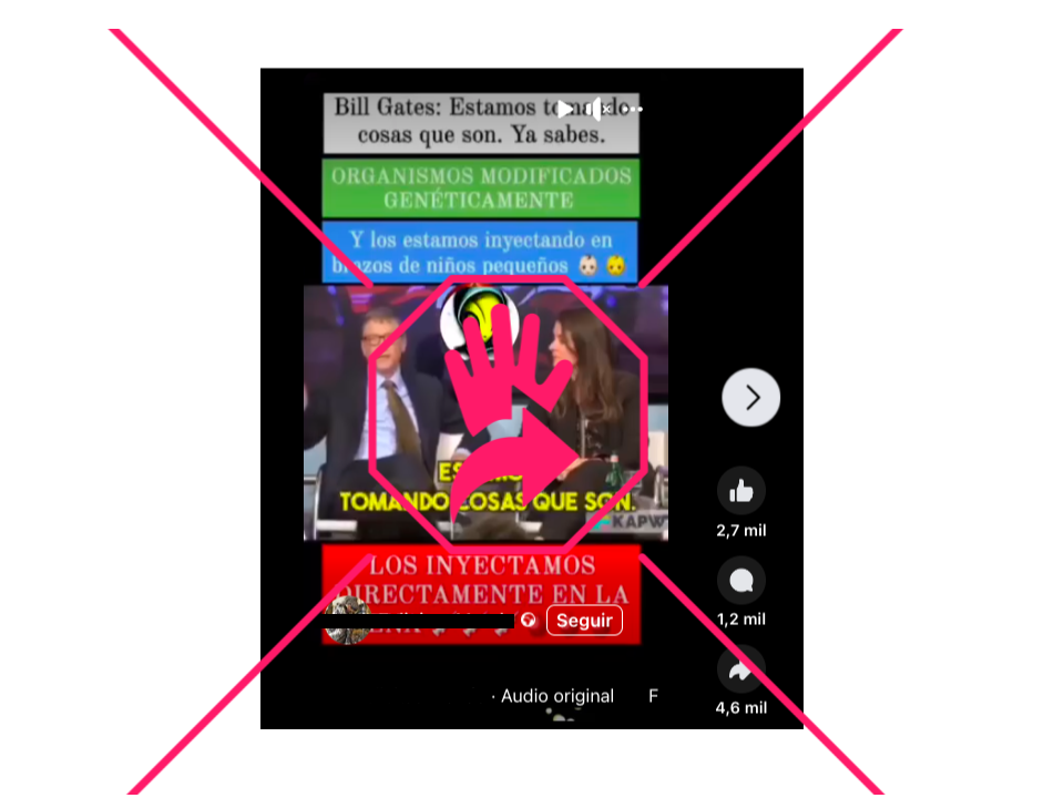 Un reel publicado en Facebook el 21 septiembre de 2024 en el que se escucha a Gates pronunciar –en inglés– la misma frase dos veces (la segunda de ellas con la voz distorsionada cuando dice “organismos genéticamente modificados”), lleva insertado un texto con la traducción al español de las palabras del empresario y sumaba más de 222,000 visualizaciones hasta el 24 de septiembre de 2024.