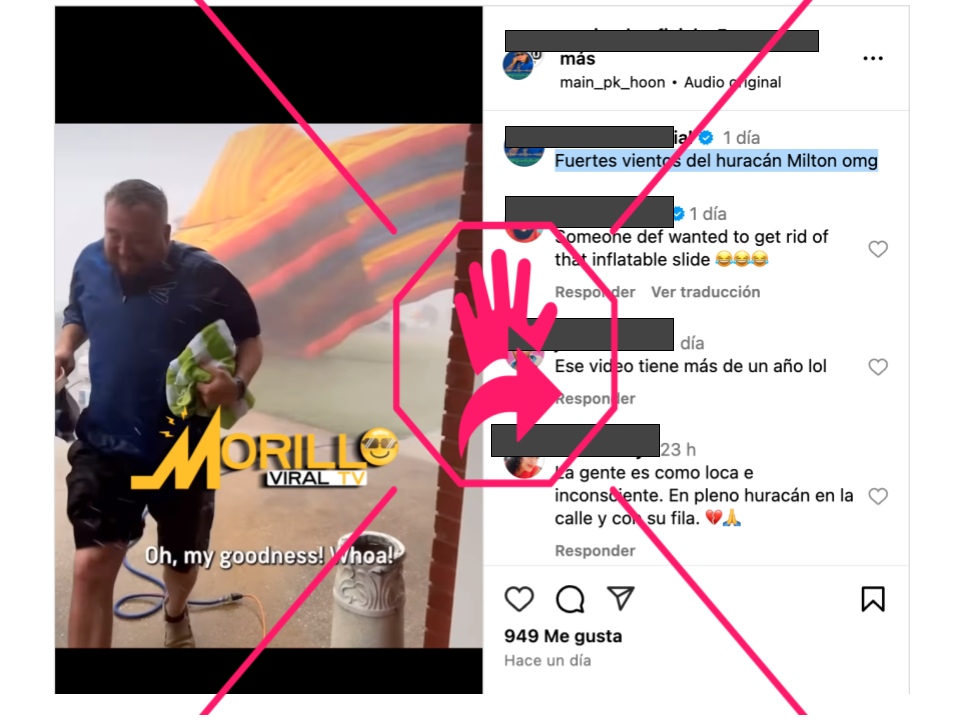 En Instagram circula un video en el que se ve a un grupo de personas corriendo y un colchón inflable siendo arrastrado por “fuertes vientos” para afirmar que éstos fueron provocados por el huracán Milton, pero eso es falso. La grabación circula desde agosto de 2024, más de un mes antes de que Milton se formara.