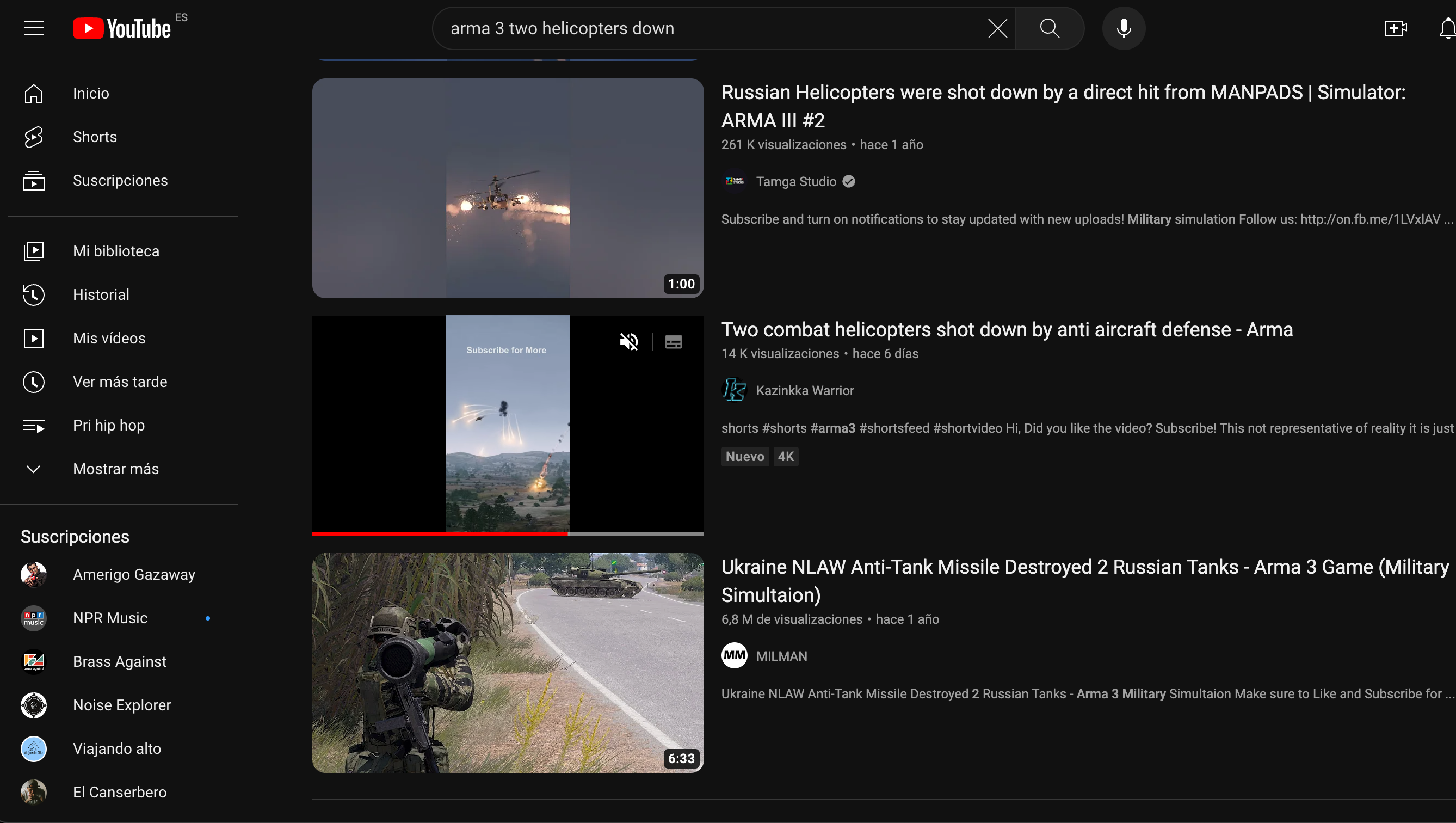 YouTube. Búsqueda con las palabras, en inglés, “arma 3 dos helicópteros derribados”. 10 de octubre de 2023.