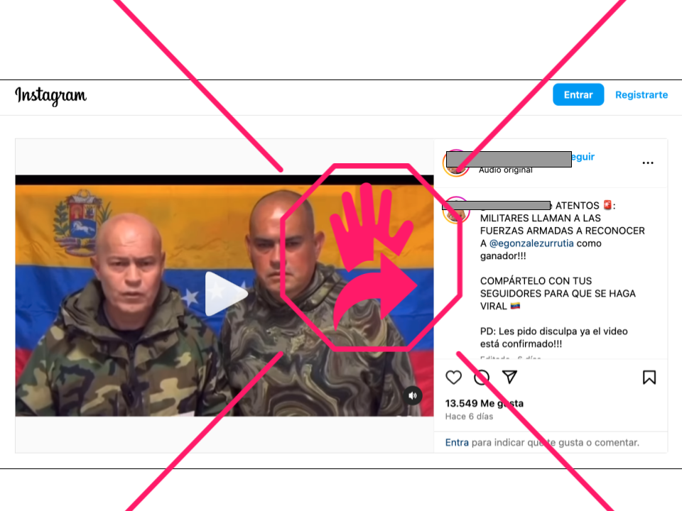 Un video en el que dos hombres con ropa camuflada y la bandera tricolor de Venezuela de fondo leen un comunicado, ha circulado en Instagram con la afirmación de que se trata de militares pidiendo a las Fuerzas Armadas de Venezuela reconocer el triunfo de Edmundo González Urrutia (candidato opositor) en las elecciones presidenciales del 28 de julio de 2024, en las que Nicolás Maduro fue declarado ganador . Sin embargo, la publicación es engañosa, pues aunque la grabación es real, esos hombres con traje militar no viven en Venezuela y son militares retirados, de acuerdo con reportes de medios de comunicación y de organizaciones defensoras de Derechos Humanos.