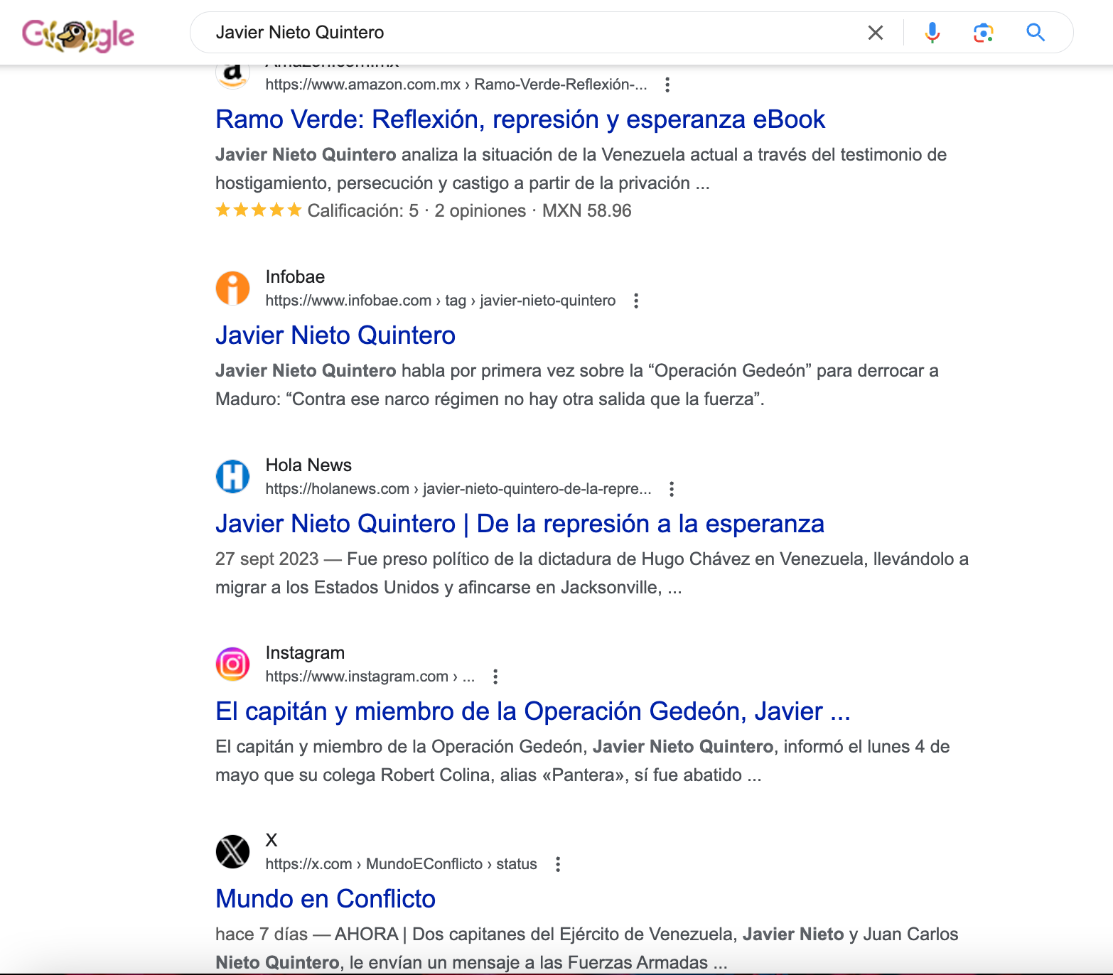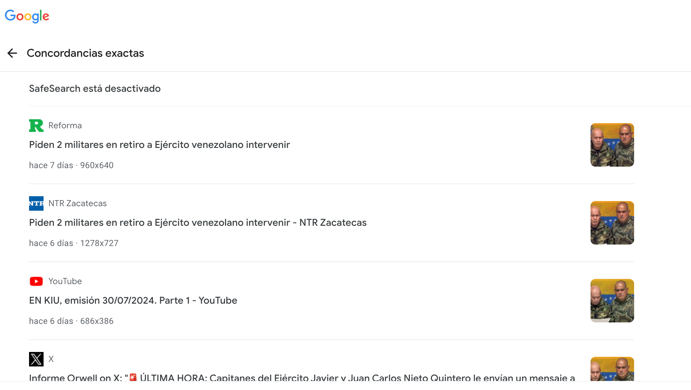 Desde elDetector realizamos una búsqueda inversa de imágenes y confirmamos que el video es real y reciente. También hicimos búsqueda en Google con los nombres que se mencionan en el video y encontramos reportes mediáticos, anteriores a julio de 2024, en los que los identifican como exmilitares o militares retirados.