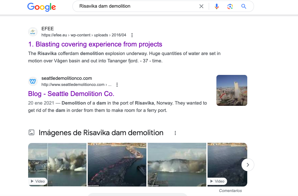 Con esta información, en elDetector hicimos una búsqueda con palabras clave en inglés en Google y encontramos un documento de la Federación Europea de Ingenieros de Explosivos (EFEE, por sus siglas en inglés) en el que se explica cómo se hizo la explosión de la barrera en el puerto de Risavika y se incluye (en la página 37) una fotografía del momento del estallido, en la que se puede distinguir la misma estructura que aparece en el video que estamos verificando.
