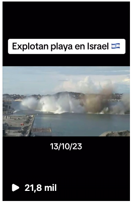 Un video en el que se ve cómo se activan cargas explosivas en una barrera en medio del agua y luego se observa el estallido de la estructura con el correspondiente aumento de la marea alrededor, está siendo compartido en Instagram junto al texto “Explotan playa en Israel” y la fecha “13/10/23”. Sin embargo esto es falso, las imágenes están fuera de contexto y corresponden realmente a una demolición controlada en el puerto de Risavika, en Noruega, en 2008.