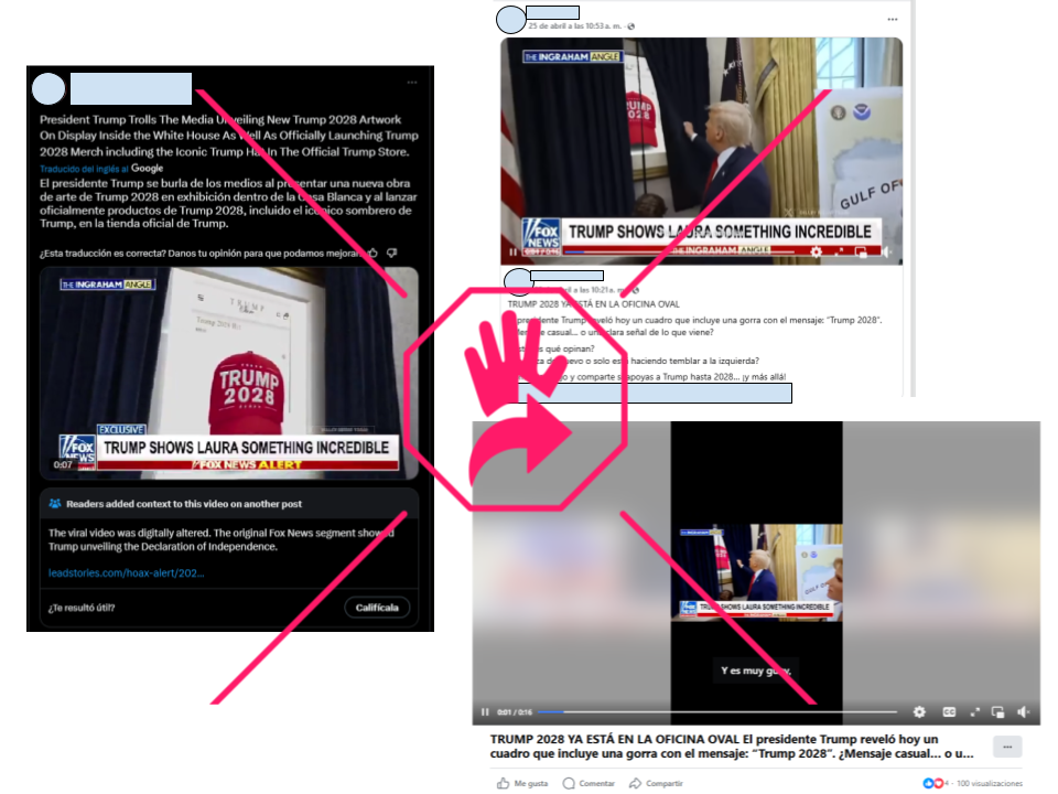 Es falso que el presidente Donald Trump muestre en un video una gorra de “Trump 2028” en un cuadro de marco dorado ubicado tras una cortina azul en la Oficina Oval. La grabación está manipulada, pues en su contexto original, el mandatario muestra el acta de la independencia de Estados Unidos. Comprobamos la falsedad de la afirmación que circula en Facebook y X (antes Twitter) con una búsqueda inversa de imágenes en Google Lens y una búsqueda en Google que nos llevó al video original de Fox News del 19 de marzo de 2025, en donde el presidente devela a la periodista Laura Ingraham el documento histórico. Lee aquí cómo escogemos y asignamos nuestras etiquetas en elDetector.