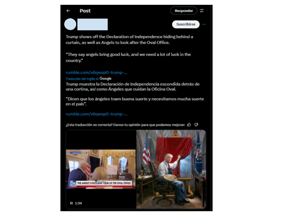 Un resultado de X del 19 de marzo de 2025 tiene una versión del mismo video que circula en abril de 2025 con la falsa afirmación de que “Trump 2028 ya está en la Oficina Oval” y la gorra roja. Tras la cortina y el marco se ve un pergamino. En el posteo de X se lee: “Trump muestra la declaración de independencia [de Estados Unidos] escondida detrás de una cortina, así como ángeles que cuidan la Oficina Oval”.