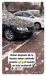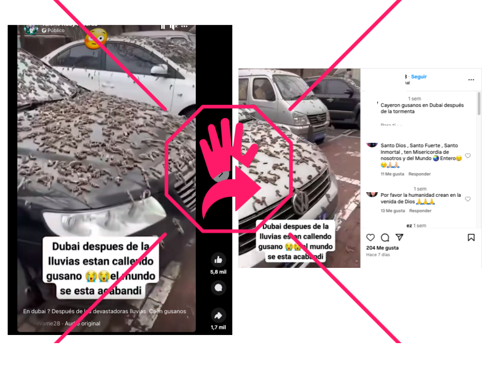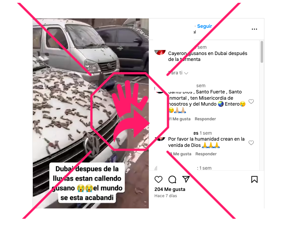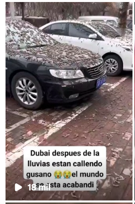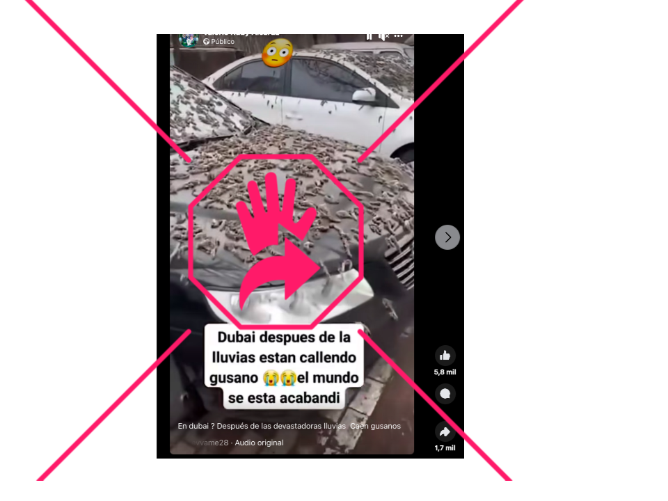 “Dubai despues [sic] de la [sic] lluvias estan [sic] callendo [sic] gusano [sic]”, dice el texto insertado en el video compartido en Facebook y que acumulaba más de 1.8 millones de visualizaciones y 5,800 “me gusta” hasta el 26 de abril de 2024. Una publicación de Instagram con la misma grabación y afirmación sumaba unas 18,000 reproducciones hasta la misma fecha.