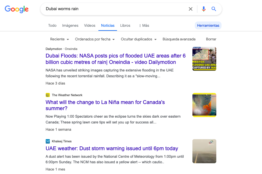 En elDetector hicimos una búsqueda con palabras clave en inglés en la sección de noticias de Google y no encontramos ninguna información reciente que hablara sobre la caída de gusanos en las calles de Dubai, algo muy improbable si en realidad hubiera ocurrido tal fenómeno después de las fuertes lluvias e inundaciones que azotaron la ciudad y que han recibido gran atención mediática.