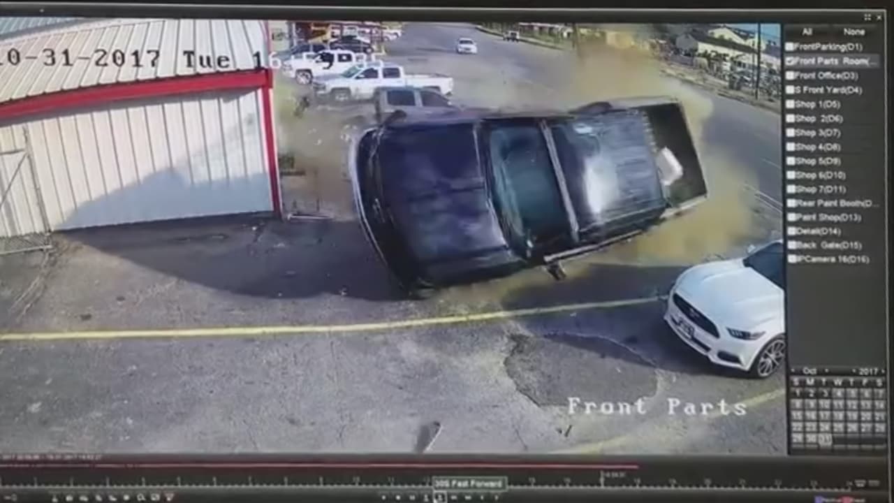 La policía compartió imágenes del choque de McTavish Raymond de 45 años, que se estrelló contra los vehículos afuera de un taller en Texas. La policía dijo que el sospechoso admitió haber fumado PCP, también conocida como fenciclidina o polvo de ángel, antes de ponerse detrás del volante.