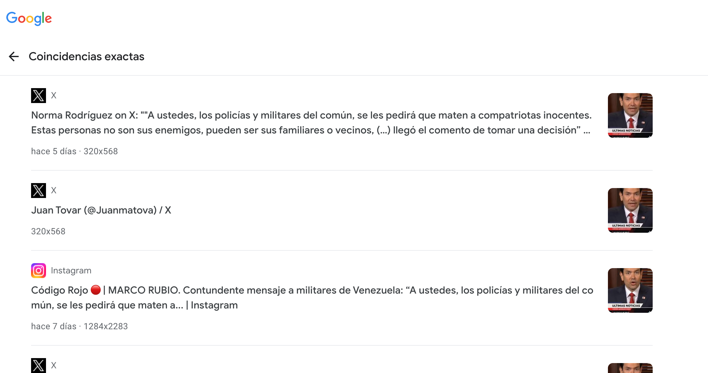Buscamos las publicaciones del 31 de julio de 2024 de Rubio en X y encontramos un mensaje con el video que dice: "A ustedes, los miembros de la policía y el ejército venezolano, se les pedirá que maten a cientos de compatriotas inocentes. Estas personas no son sus enemigos. Estas personas pueden ser tus parientes, vecinos o tus amigos”.