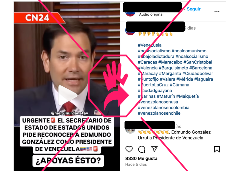 “Urgente. El Secretario de Estado de Estados Unidos pide reconocer a Edmundo González como presidente de Venezuela. ¿Apoyas esto?”, dice un mensaje que está sobrepuesto a un video en el que aparece Rubio hablando. En la esquina superior izquierda hay un gráfico de letras blancas sobre fondo rojo que dice CN24.
