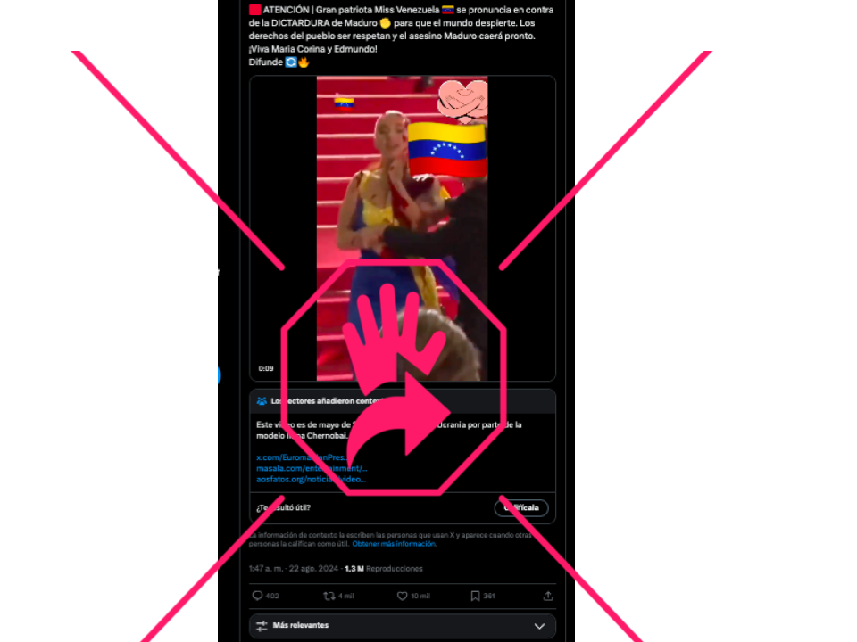 “Atención. Gran patriota Miss Venezuela se pronuncia en contra de la dictadura de Maduro para que el mundo despierte”, dice una publicación en X (antes Twitter), con más de 1.3 millones de reproducciones y que incluye la secuencia en la que también se ve cómo un hombre y una mujer retiran del lugar a la supuesta reina de belleza.