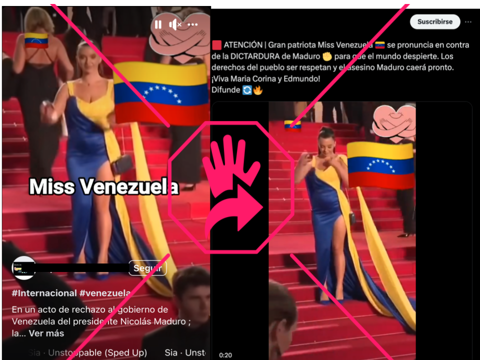 Circula en redes sociales el video de una mujer que viste un vestido amarillo con azul, mientras camina por una alfombra roja y que, de pronto, vierte un líquido rojo sobre ella misma. Afirman que se trata de Miss Venezuela protestando contra el gobierno del presidente venezolano, Nicolás Maduro, pero eso es falso. El video está fuera de contexto, pues circula en Internet desde mayo de 2023 y no está relacionado con Venezuela, su reina de belleza o su mandatario.