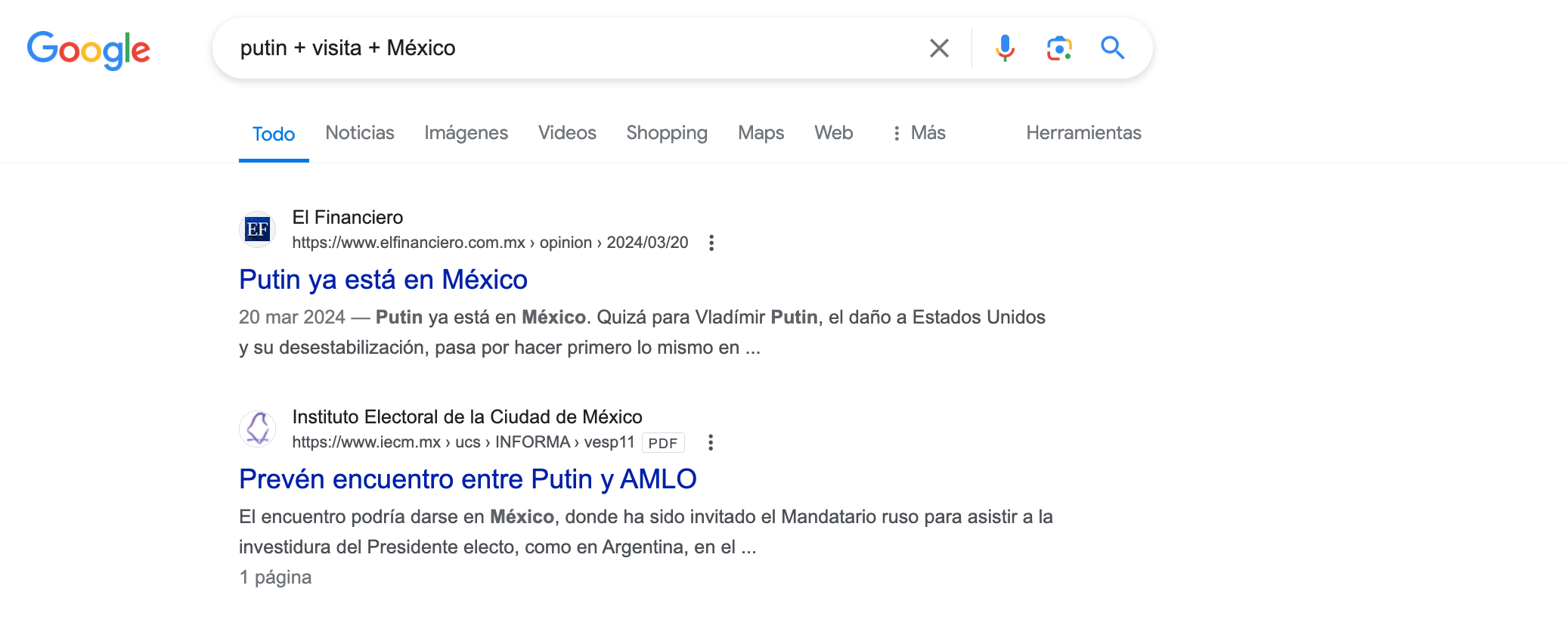 Tras realizar una búsqueda en Google tampoco encontramos reportes mediáticos que confirmen que Putin ha visitado México en lo que va de 2024. El primer resultado que aparece es un artículo de opinión que habla sobre el aumento del número de diplomáticos rusos en México en 2024; el segundo es un comunicado del Instituto Electoral de la Ciudad de México que data de 2018 en el que se plantea la posibilidad de que Putin visite México para la toma de posesión del actual presidente mexicano Andrés Manuel López Obrador, lo cual no ocurrió.
