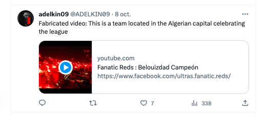 En elDetector notamos que en una de las publicaciones en TikTok varios usuarios advierten que las imágenes no tienen que ver con el conflicto entre Hamas e Israel y aseguran que corresponden a una celebración futbolística en la ciudad de Argel (Argelia). Y lo mismo ocurre en una publicación en X, en la que incluso adjuntan un video de los festejos en 2020 de los seguidores del equipo CR Belouizdad.