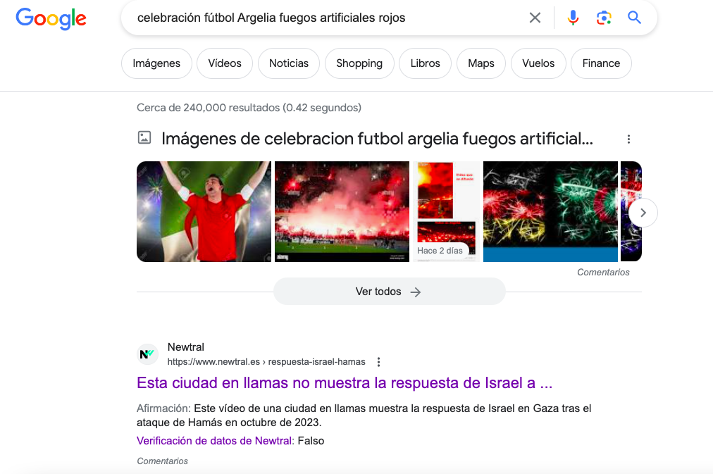 Con esta información, realizamos una búsqueda por palabras clave en Google y encontramos que verificadores de Newtral, miembro como elDetector del International Fact-Checking Network (IFCN), desmintieron que el mismo video que estamos revisando correspondiera a un ataque de Israel y lo relacionaron también con las celebraciones de fútbol en Argelia mencionadas por los usuarios que advertían de la falsedad del post en varias redes sociales.