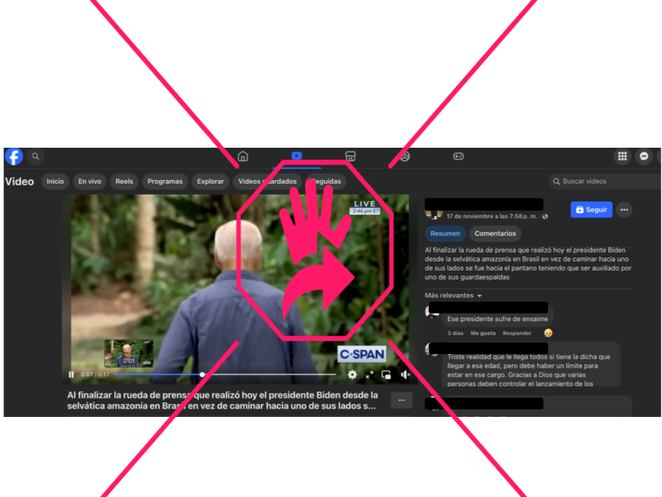 Publicaciones en Facebook muestran un video afirmando que tras una conferencia de prensa en la selva amazónica de Brasil, el presidente de los Estados Unidos, Joe Biden, se “confundió” o se “desorientó” y tomó un camino equivocado que llevaba a un pantano o al interior del bosque, pero eso es falso. El mandatario no fue el único que caminó por ese sendero y grabaciones muestran que otras personas también lo transitaron tanto antes como después de terminar la conferencia.