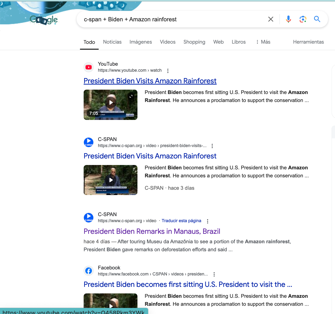Desde elDetector hicimos una búsqueda con palabras clave en Google y encontramos una grabación de 7:08 minutos que fue capturada por C-SPAN el 17 de noviembre de 2024, durante una visita del presidente a la reserva forestal Adolpho Ducke, en Manaos, Brasil.