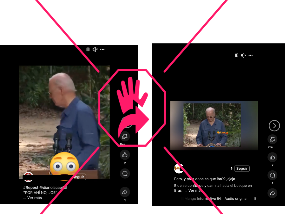 “Al finalizar la rueda de prensa que realizó hoy el presidente Biden desde la selvática amazonía en Brasil en vez de caminar hacia uno de sus lados se fue hacia el pantano teniendo que ser auxiliado por uno de sus guardaespaldas”, dice un mensaje de Facebook que acompaña un video.