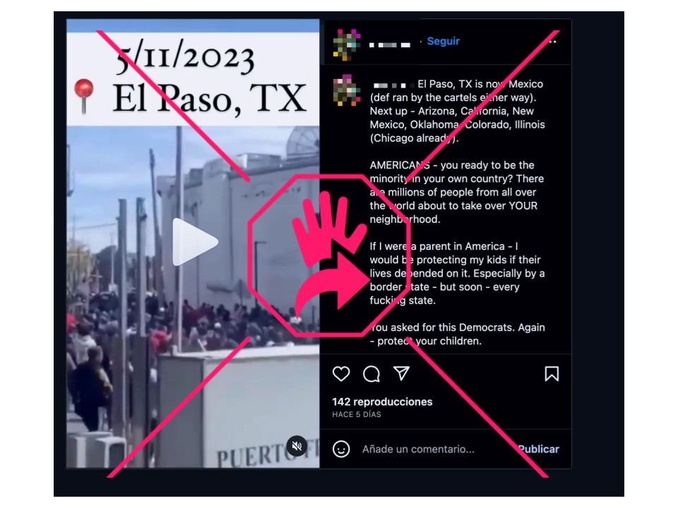 “El Paso, TX es ahora México”, se lee, en inglés, en la publicación analizada, que viene acompañada de un video, compuesto por dos grabaciones distintas, en el que se ve a una multitud cruzando lo que parece ser un puente. Durante todo el video, se puede leer sobrescrito: “5/11/2023. El Paso, TX”.