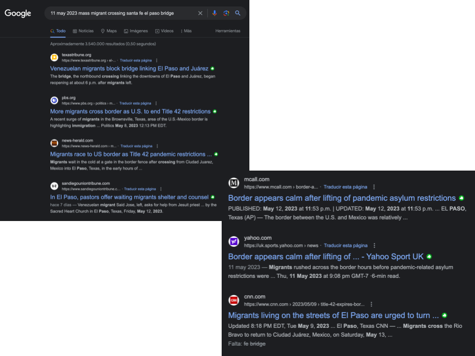 Por otro lado, no se produjo un intento de cruce ilegal masivo el 11 de mayo. Como ya vimos anteriormente, una búsqueda en Google con las palabras clave, en español, "11 mayo 2023 cruce masivo migrantes puente Santa Fe El Paso” no facilita resultados en medios de comunicación de prestigio que recojan que ocurrió tal cosa esa jornada, día que aparece sobrescrito durante todo el video analizado. Una búsqueda con esas mismas palabras en inglés tampoco arrojó resultados.