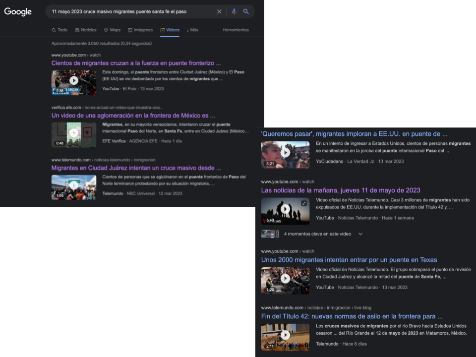 Sin embargo, una búsqueda en Google con las palabras clave “11 mayo 2023 cruce masivo migrantes puente Santa Fe El Paso” revela que, al menos, esa grabación es del 12 de marzo de 2023; es decir, de prácticamente dos meses antes.