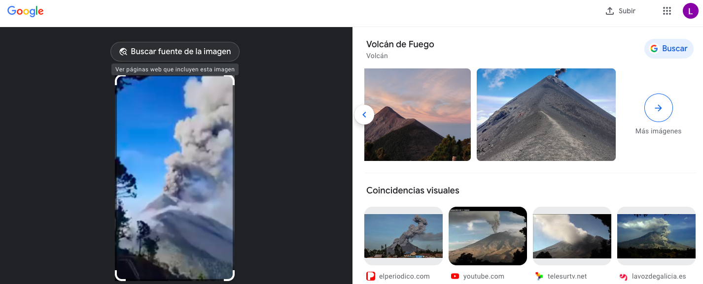 En elDetector hicimos una búsqueda inversa en Google a partir de una de las imágenes iniciales del video y, en primer lugar, encontramos que el propio buscador la identifica como correspondiente al Volcán de Fuego, en Guatemala. Además, nos lleva a publicaciones hechas en redes sociales el 4 de mayo en las que se dice que las imágenes son de la erupción del coloso guatemalteco.