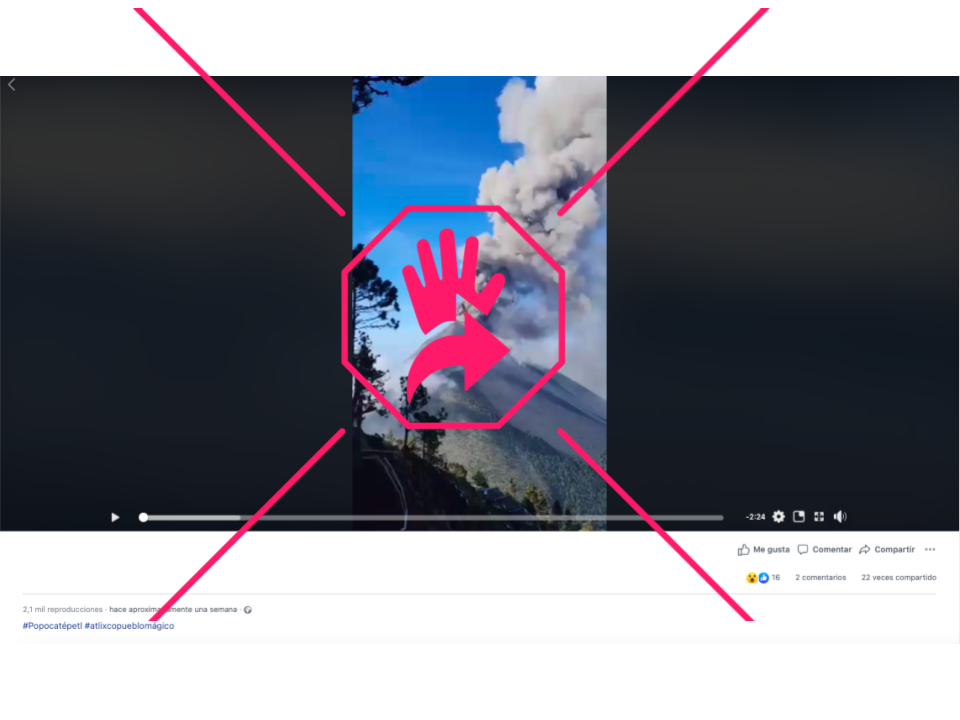 “Impresionantes imagines [sic] del Popocatepetl”, dice uno de los videos publicado el 21 de mayo de 2023 y que tenía más de 1,000 reproducciones menos de 24 horas después. El mismo clip, en el que primero se ve la actividad volcánica a distancia (captada desde una montaña adyacente) y luego una serie de imágenes de las explosiones y la salida de humo y ceniza ampliadas con zoom, fue divulgado también el 14 de mayo en otra cuenta de Facebook con la etiqueta “#Popocatépetl” y sumaba más de 2,000 visualizaciones.