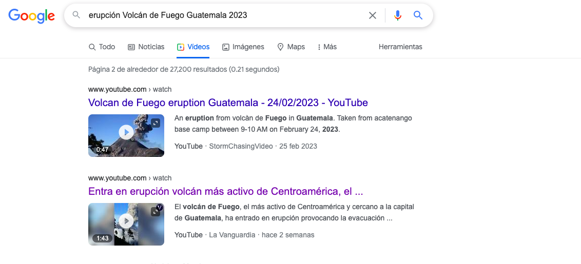 Entonces, mediante una búsqueda por palabras clave (erupción Volcán de Fuego Guatemala 2023) en el apartado de Videos de Google, encontramos las imágenes en el canal de YouTube del diario español La Vanguardia y otras muy similares en la cuenta en Twitter de la agencia Reuters. Incluso en un video publicado el 4 de mayo por Univision Noticias sobre la erupción del Volcán de Fuego, las imágenes tomadas de día son las mencionadas de Reuters.