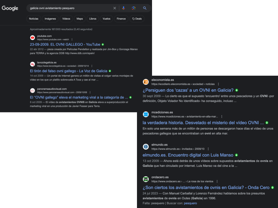 Google. Búsqueda con las palabras clave “galicia ovni avistamiento pesquero”. Consultado el 1 de agosto de 2023.