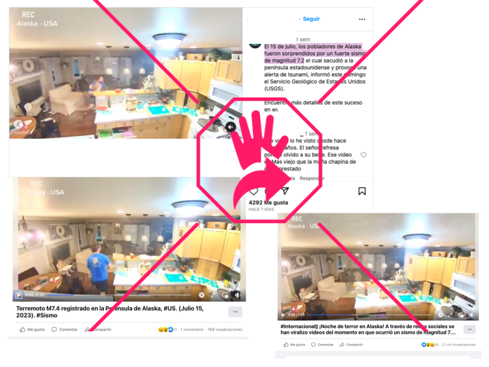 “¡Noche de terror en Alaska! A través de redes sociales se han viralizo [sic] videos del momento en que ocurrió un sismo de magnitud 7.2 en Alaska”, “El 15 de julio, los pobladores de Alaska fueron sorprendidos por un fuerte sismo de magnitud 7.2”, dicen algunas de las publicaciones compartidas en Facebook y en Instagram horas después del terremoto y en las que es incluido el video que muestra el interior de una casa familiar.