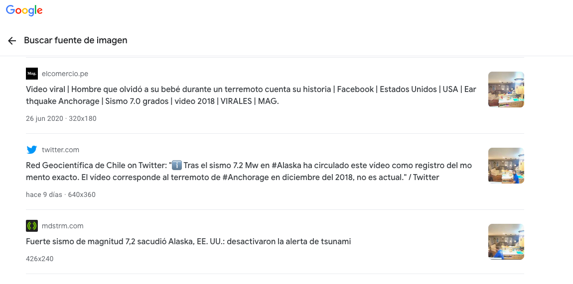 En elDetector hicimos una búsqueda inversa de imagen en Google y encontramos varias notas publicadas en junio de 2020 que explican que aunque el video se hizo viral también ese año, luego de un terremoto de 7.5 grados en México, las imágenes realmente fueron captadas durante un sismo ocurrido en Alaska el 30 de noviembre de 2018. En esos artículos incluso se detalla que el padre observó que su bebé estaba seguro en la silla antes de salir de la habitación a buscar a otro hijo.