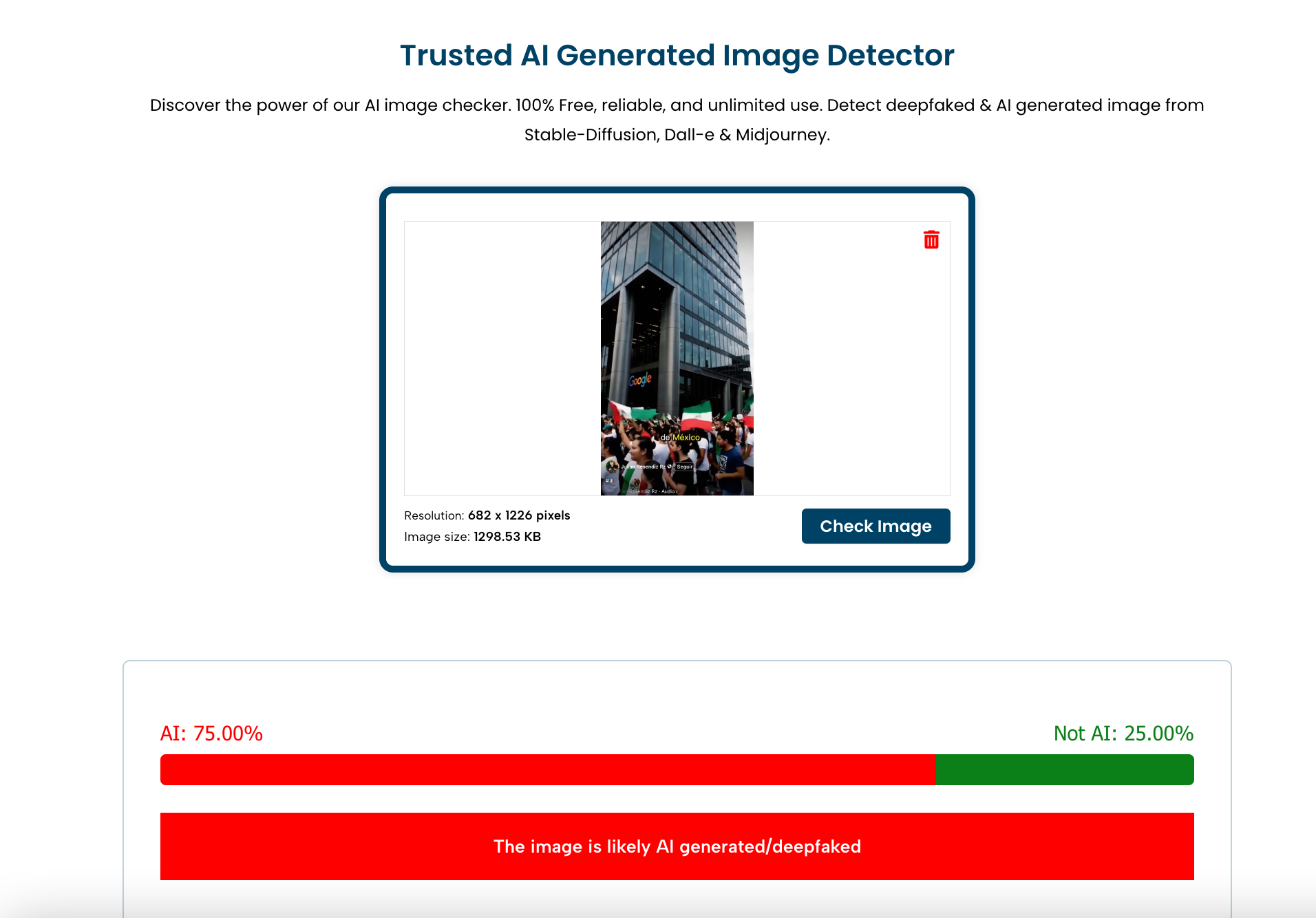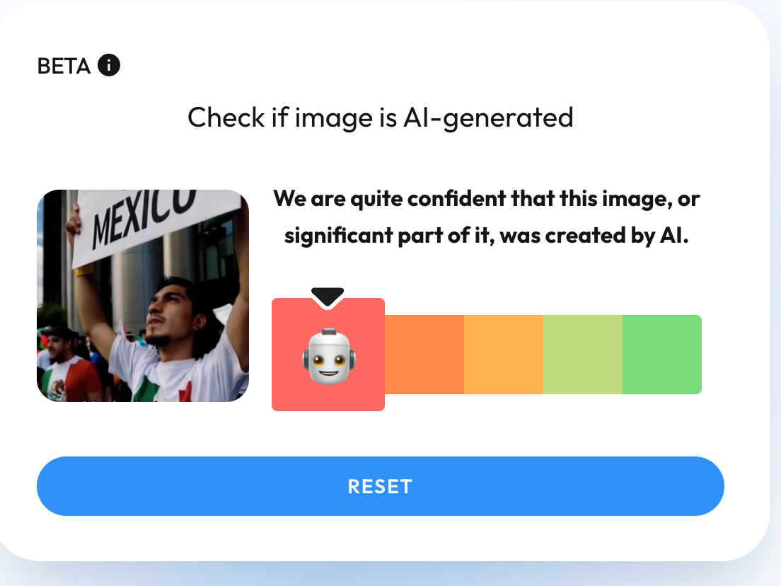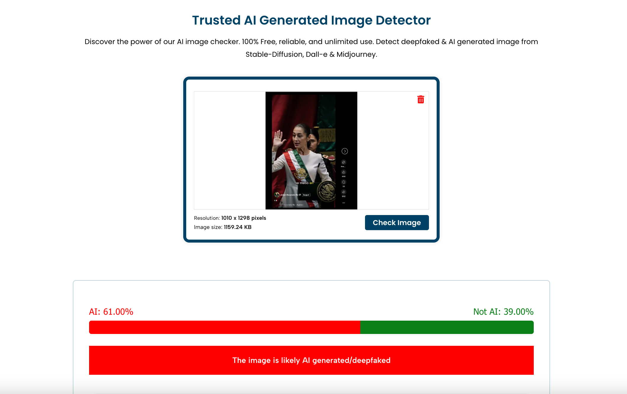 Desde elDetector analizamos algunas de las imágenes que aparecen en el video con herramientas de detección de IA. WasItAI señaló que había una posibilidad del 61%, 95%, 71% y 75% de que hubieran sido creadas con inteligencia artificial y AIDetectContent también determinó que había un alta posibilidad de que hubieran sido creadas de la misma forma.