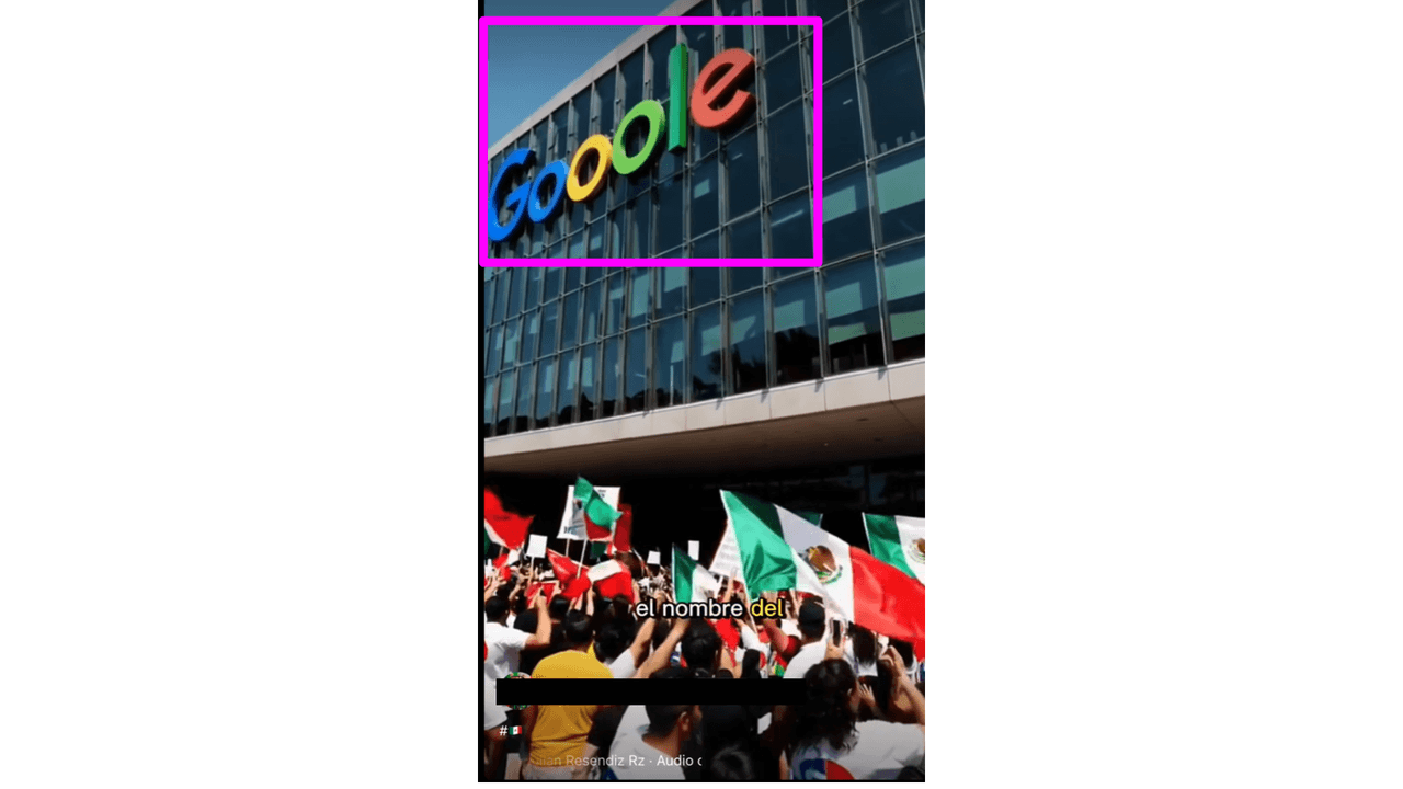 También hay un momento en el que se ve el logo de Google afuera del supuesto edificio de la compañía donde protestaban mexicanos, pero el mismo dice “Gooole”, con lo que se nota que tampoco es real (recuadro rosa en la imagen a continuación)
