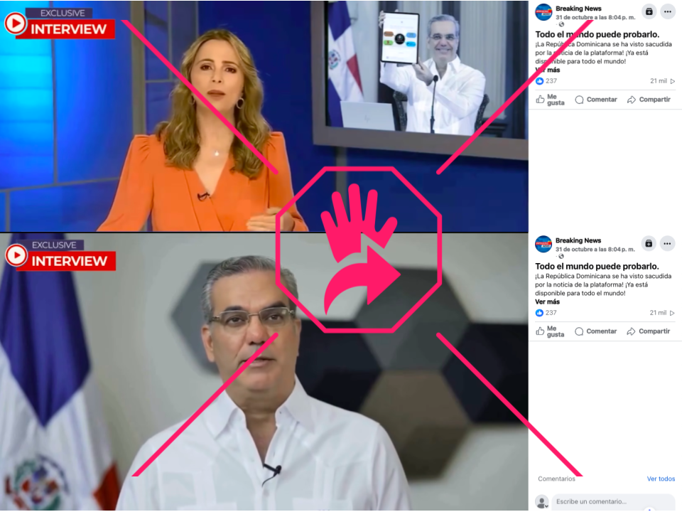 Aunque no se refiere exactamente a la grabación en la que aparece con el vestido naranja, sino a otras de presuntas estafas, en esa misma denuncia explica que incluso han sido alterados videos del presidente Abinader y muestra el mismo video del mandatario que estamos chequeando supuestamente ofreciendo una oportunidad de inversión, con un sello de “Falso” superpuesto.