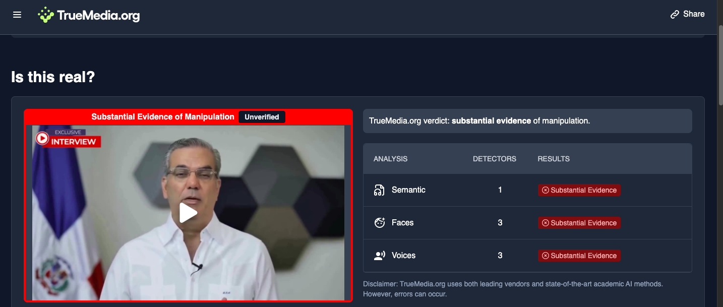 Introdujimos entonces el video en TrueMedia, una herramienta de detección de contenidos generados con IA, y la misma encontró “evidencia sustancial de manipulación” tanto en las voces como en los rostros, además de algunas “inconsistencias semánticas”.