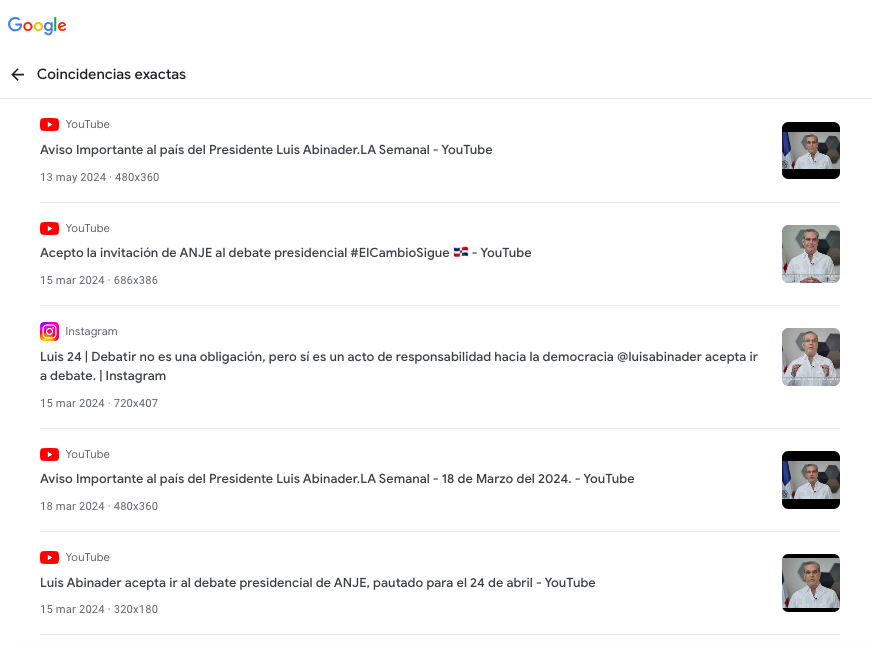 Igualmente, realizamos una búsqueda inversa de imagen en Google Lens partiendo del clip en el que se ve a Abinader y en las concordancia exactas hallamos varias noticias y videos en los que se ve al presidente con una camisa blanca y frente al mismo fondo de hexágonos grises –junto a una bandera de un lado– que aparece en el clip que estamos chequeando. Todos los resultados coinciden en que en el video el mandatario en realidad anunciaba que participaría en un debate previsto para abril de 2024 y no sobre una plataforma para obtener dinero.