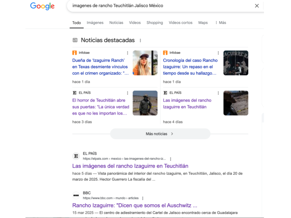 También hicimos una búsqueda con palabras clave en Google y esta arrojó varios reportes de medios con imágenes del rancho captadas durante una visita realizada el pasado 21 de marzo de 2025. Ninguna de las fotografías publicadas coincide con las secuencias mostradas en el video.