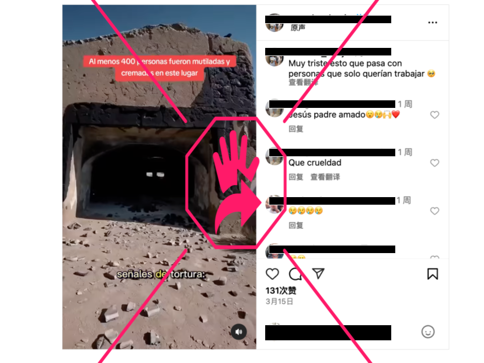 “Muy triste esto que pasa con personas que solo querían trabajar”, dice el texto que acompaña una grabación en la que se ve al inicio una construcción marrón ubicada en un terreno en el que se ven tirados decenas de zapatos a la redonda. Sobre las imágenes se lee la leyenda: “Al menos 400 personas fueron mutiladas y cremadas en este lugar”.