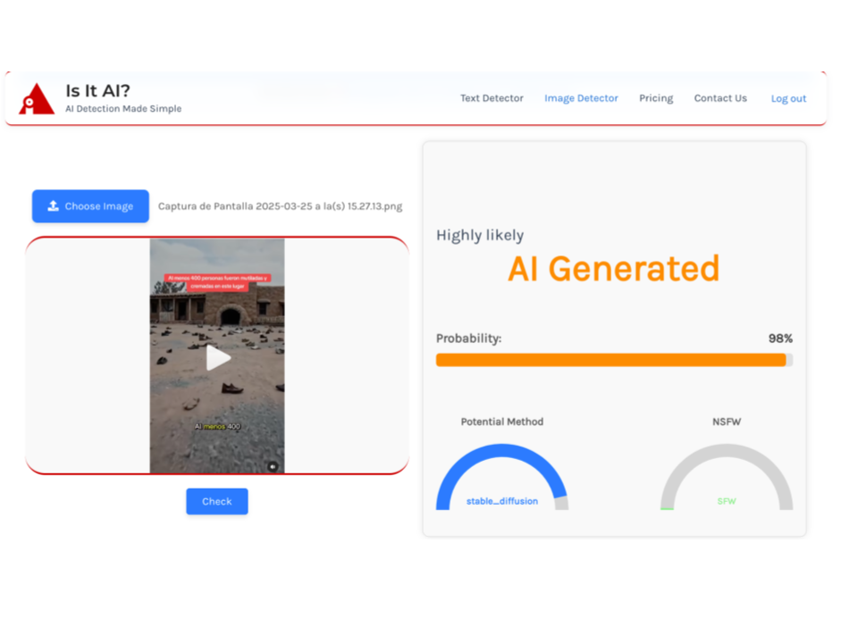 También IsitAI, otra herramienta gratuita, determinó con un 98% de probabilidad que la imagen fue generada mediante IA.