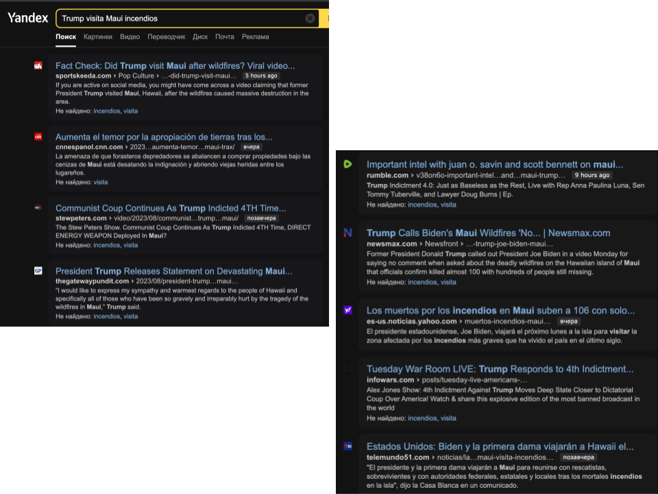 Yandex. Búsqueda con las palabras clave “Trump visita Maui incendios”. 18 de agosto de 2023.