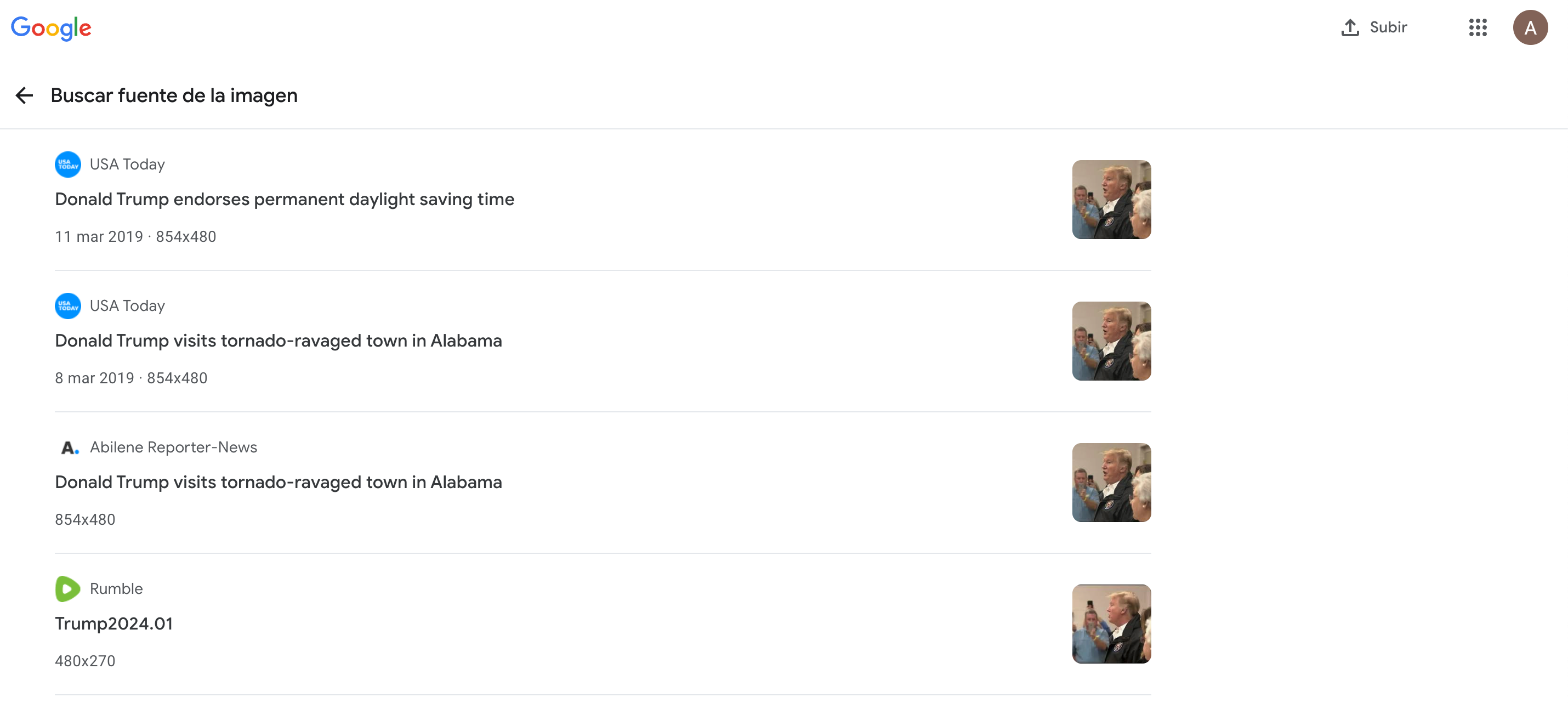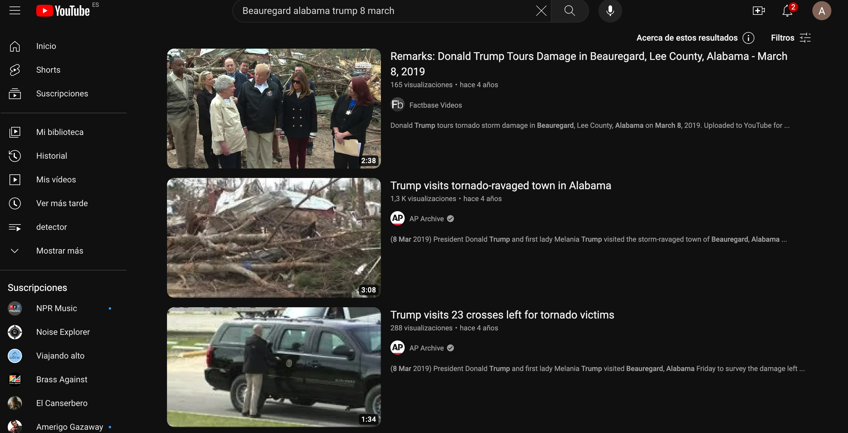 Con los datos de la fecha y el lugar facilitados en la nota de USA Today, hicimos una búsqueda en YouTube con las palabras clave, en inglés, “Beauregard Alabama Trump 8 marzo”. El resultado es el video original, en el canal de YouTube de AP Archive, de la cobertura que esta agencia hizo de la visita de Trump a esa localidad aquel 8 de marzo de 2019. Su título es “Trump visita un pueblo de Alabama devastado por un tornado” y fue subido a la plataforma el 13 de ese mes.