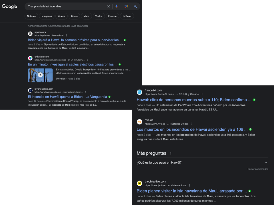 Una búsqueda en Google, Yandex y Bing con las palabras clave “Trump visita Maui incendios” no da ningún resultado en medios de comunicación de prestigio en el que se informe que el líder republicano haya estado en la isla hawaiana recorriéndola y reuniéndose con los afectados por los fuegos.
