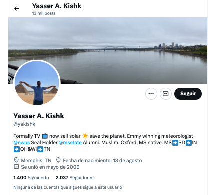 También hicimos una búsqueda con palabras clave en Google y hallamos más notas informando sobre la tormenta de arena del 1 de junio de 2023 en Egipto, incluida una que atribuía la grabación a la cuenta de Twitter @yakishk. Así que revisamos su perfil en esa red social (ahora llamada X) y encontramos el video publicado ese mismo día por ese usuario, que se identifica como un meteorólogo que trabajó para Fox en Memphis y que fue reconocido como tal por la Asociación Nacional del Clima (NWAS, por sus siglas en inglés).
