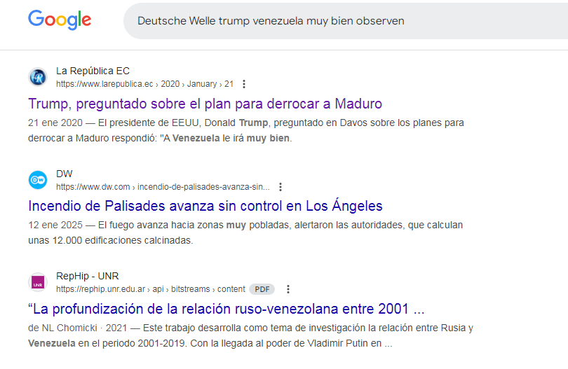 Con esa información, hicimos una nueva búsqueda con palabras clave en Google y encontramos un par de artículos que también datan de enero de 2020 y que recogen las palabras pronunciadas por Trump respecto a Venezuela que están circulando en 2025 como si fueran actuales. Una de las notas periodísticas, de La República de Ecuador, incluso incluye una publicación en X (antiguo Twitter) de Deutsche Welle con el mismo video que estamos verificando, aunque en mejor calidad y con una duración ligeramente mayor.