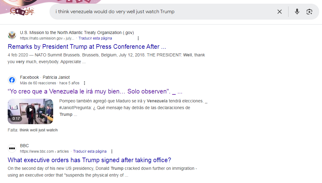 En elDetector hicimos una búsqueda con palabras clave en Google usando la frase pronunciada por Trump –en inglés– y encontramos entre los resultados una publicación de Facebook de la periodista Patricia Janiot hecha el 22 de enero de 2020, que incluye el mismo video de Trump respondiendo la pregunta sobre su plan para hacer frente al gobierno de Venezuela.