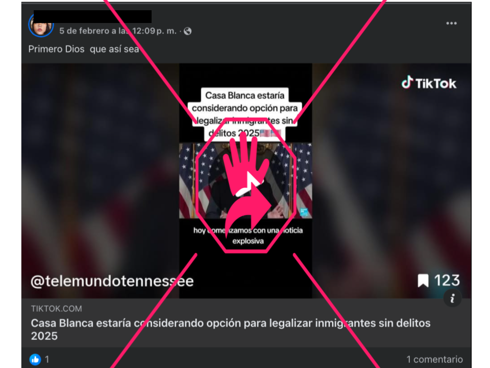 “Casa Blanca estaría considerando la opción para legalizar inmigrantes sin delitos 2025. Hoy comenzamos con una noticia explosiva”, dice el mensaje sobrepuesto al video que muestra imágenes del mandatario y algunas fotografías de migrantes.