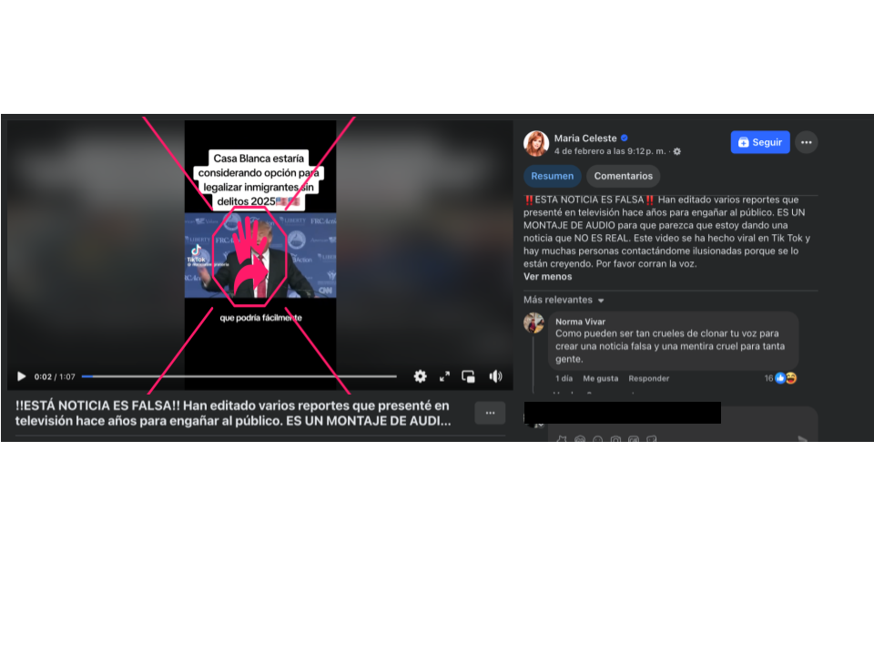 Al revisar los perfiles oficiales de María Celeste Arrarás en redes sociales, encontramos un posteo en Facebook, compartido el 4 de febrero de 2025, en el que niega que el contenido que estamos verificando sea real.
