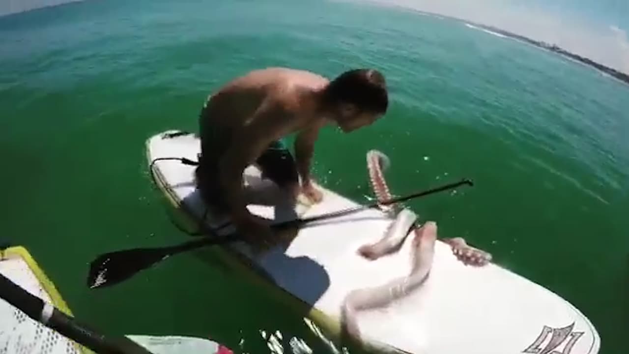 Video: Un calamar gigante envuelve con sus tentáculos la tabla de surf de un joven