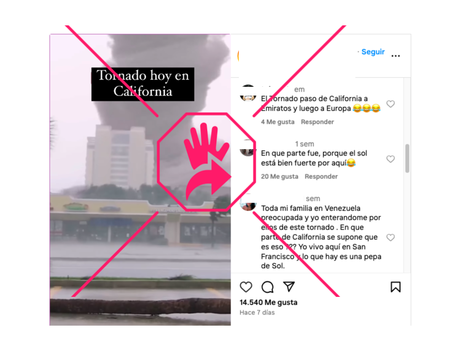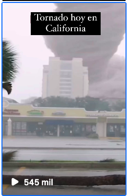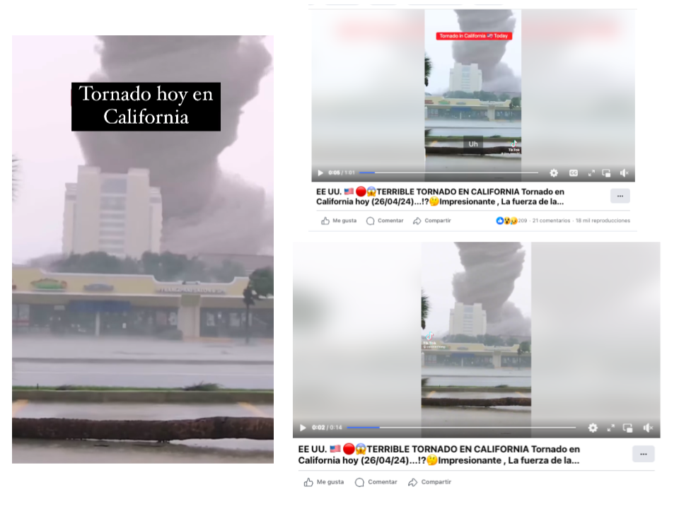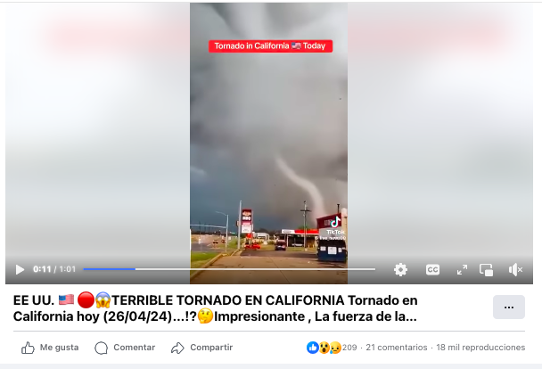 “Tornado hoy en California”, se lee en el texto de letras blancas y fondo negro de un video publicado el 21 de mayo de 2024 en Instagram y que una semana después acumulaba más de 14,500 me gusta y 545,000 visualizaciones. Mientras que otras grabaciones compartidas en Facebook el 29 de abril van acompañadas de un texto que dice “EEUU. Terrible tornado en California. Tornado en California hoy (26/04/24)”.
