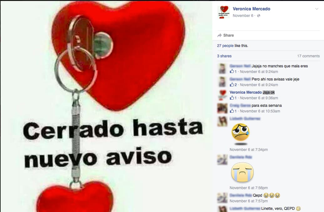 El viernes 6 de noviembre de 2015 a las 8:54 a.m., en el perfil de Facebook de Verónica Mercado, de 26 años de edad, apareció publicada una imagen en la que se ve una cerradura en forma de corazón con la llave puesta y se lee un mensaje que dice “Cerrado hasta nuevo aviso”.